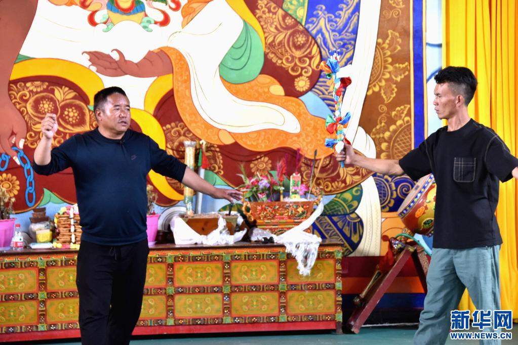 紮西曲登社區居委會(hui) 主任尼瑪次仁(左一)指導年輕人排練藏戲(2021年7月15日攝)。新華社記者陳尚才 攝