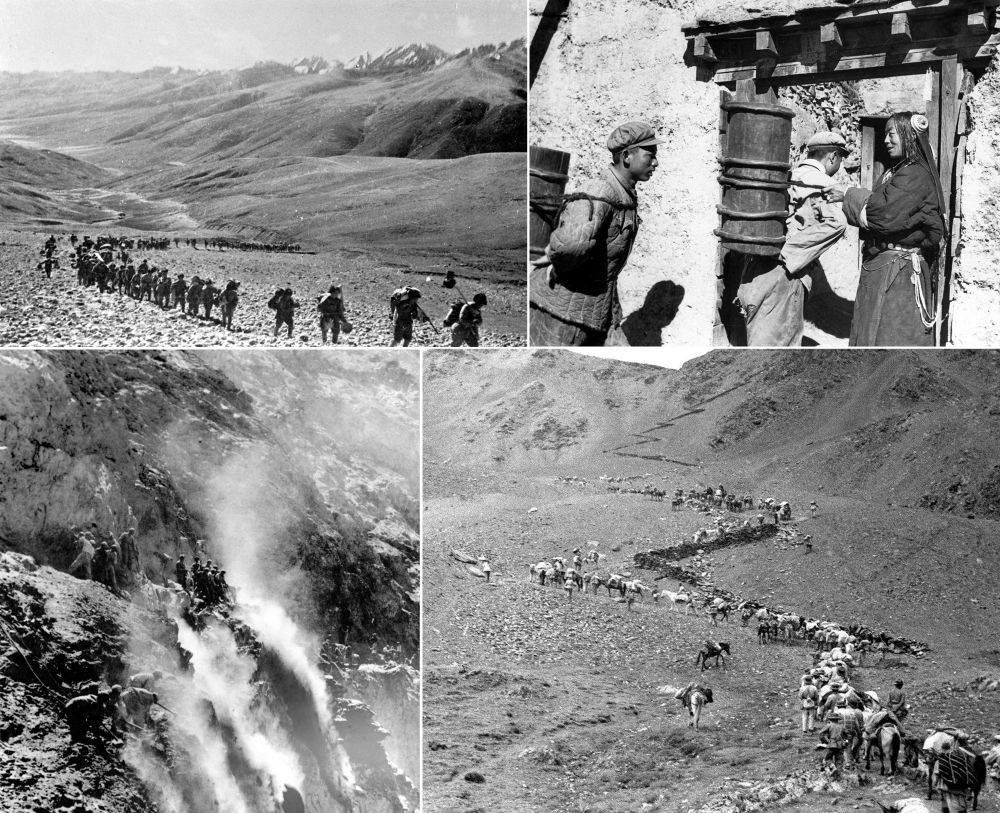 左上圖為(wei) 1950年,人民解放軍(jun) 戰士跋涉在高山峻嶺間向西藏前進(資料照片);右上圖為(wei) 人民解放軍(jun) 戰士在執勤空隙為(wei) 藏族老百姓背水(資料照片,張正模攝);左下圖為(wei) 築路戰士在懸崖絕壁上修建川藏公路(資料照片);右下圖為(wei) 1951年7月,解放軍(jun) 第十八軍(jun) 進藏先遣部隊行進在瓦合山上(新華社記者袁克忠攝)。