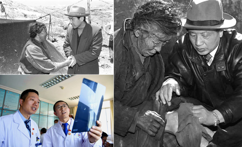 左上圖為(wei) 來自陝西的援藏幹部、阿裏日土縣副縣長賈冗勇深入牧區,幫助藏族牧民解決(jue) 生產(chan) 、生活的實際困難(新華社記者土登攝,1997年11月11日發);左下圖為(wei) 2017年8月3日,北京積水潭醫院援藏醫生龔曉峰(右)和北京天壇醫院援藏醫生李家謀在拉薩市人民醫院骨科病房內(nei) 查看患者的X光片,進行工作交接(新華社記者晉美多吉攝);右圖為(wei) 孔繁森(右)在阿裏日土縣過巴鄉(xiang) 為(wei) 孤寡老人益西卓瑪治病(新華社記者土登攝,1994年12月26日發)。