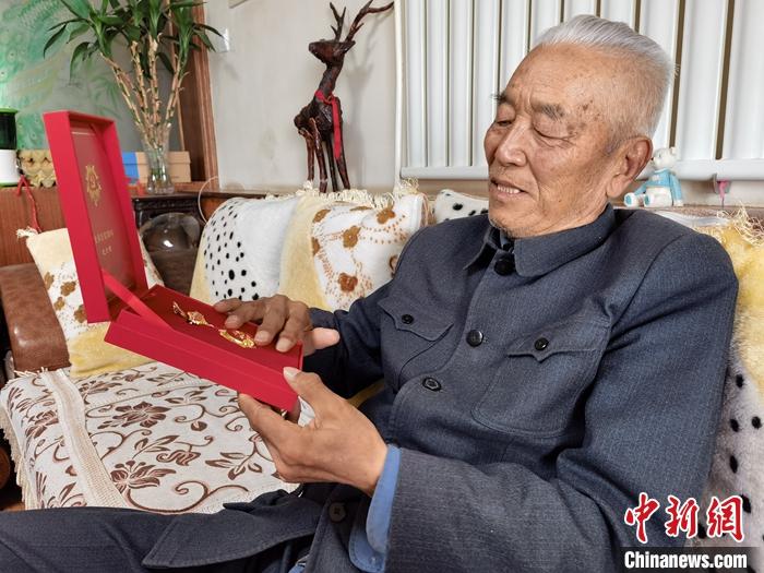 資料圖為(wei) 7月27日,西藏運輸總隊成立後第一批進藏的駝工李興(xing) 仁向記者展示自己獲得的“光榮在黨(dang) 50年紀念章”。 中新社記者 祁增蓓 攝