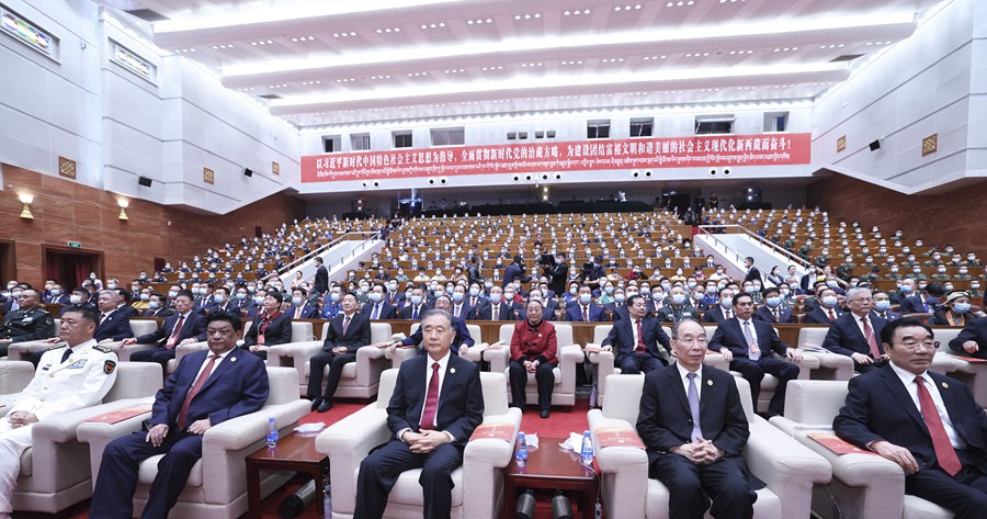 19日下午,西藏人民會(hui) 堂燈光璀璨,洋溢著熱鬧喜慶的氛圍。慶祝西藏和平解放70周年文藝演出《西藏兒(er) 女心向黨(dang) 》在這裏精彩上演。中共中央政治局常委、全國政協主席、中央代表團團長汪洋,與(yu) 西藏自治區各族各界幹部群眾(zhong) 600餘(yu) 人一起觀看演出。