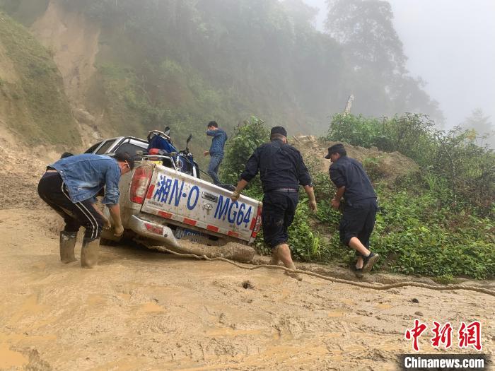 圖為(wei) 背崩邊境派出所民警對被困車輛進行救援。背崩邊境派出所供圖
