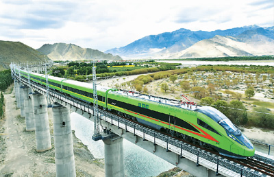 複興(xing) 號列車行駛在西藏山南市境內(nei) 。新華社記者 覺 果攝