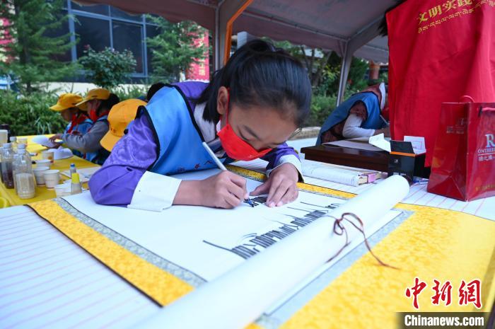 圖為(wei) 學生在寫(xie) 藏文書(shu) 法。 趙朗 攝