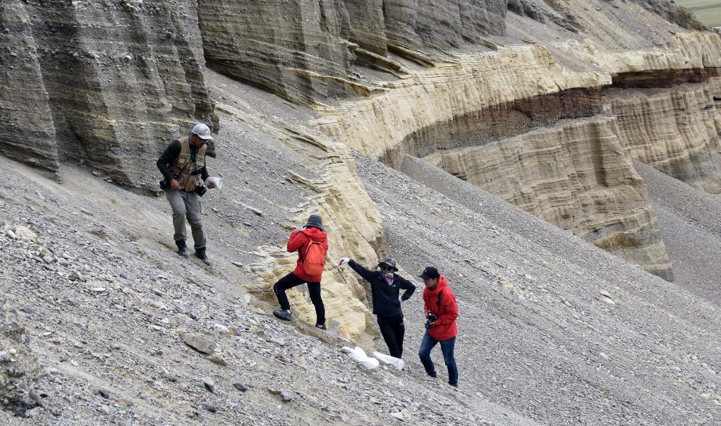 8月27日,科考隊員王昊(左)等人在西藏日喀則市定結縣區域內(nei) 考察一個(ge) 垂直地麵的沉積剖麵。隊員們(men) 根據傾(qing) 斜層理判斷,數萬(wan) 年前這裏是一個(ge) 巨大的堰塞湖。新華社記者杜剛 攝