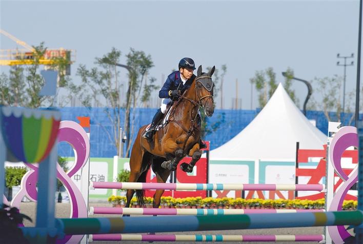 西藏自治區選手在進行馬術三項賽團體(ti) 賽的最後一項比賽場地障礙賽。