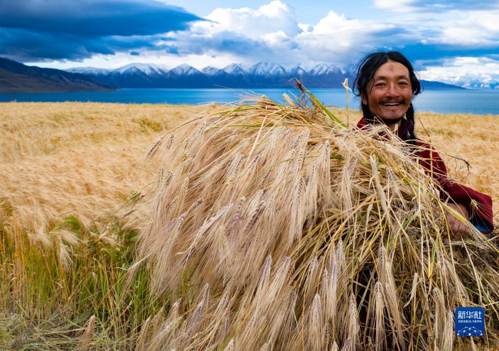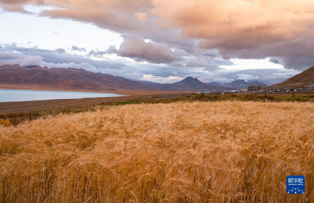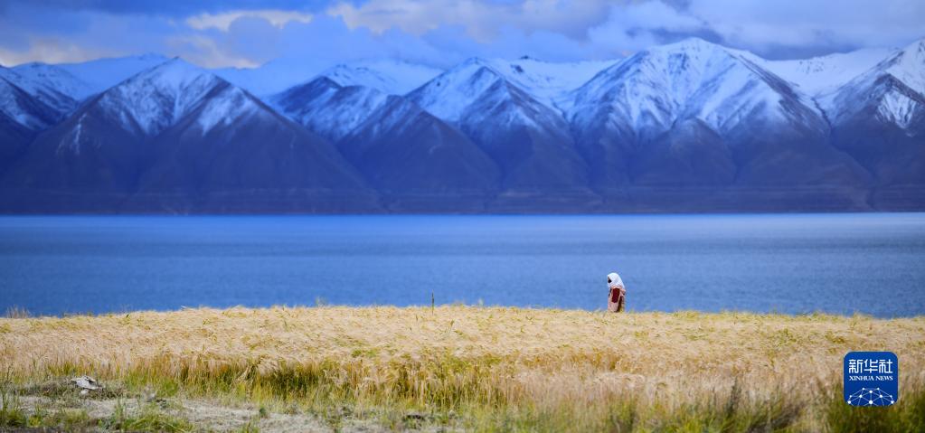 9月23日在西藏那曲市尼瑪縣文部鄉(xiang) 文部南村拍攝的金色的青稞和雪山湖泊。新華社記者 晉美多吉 攝
