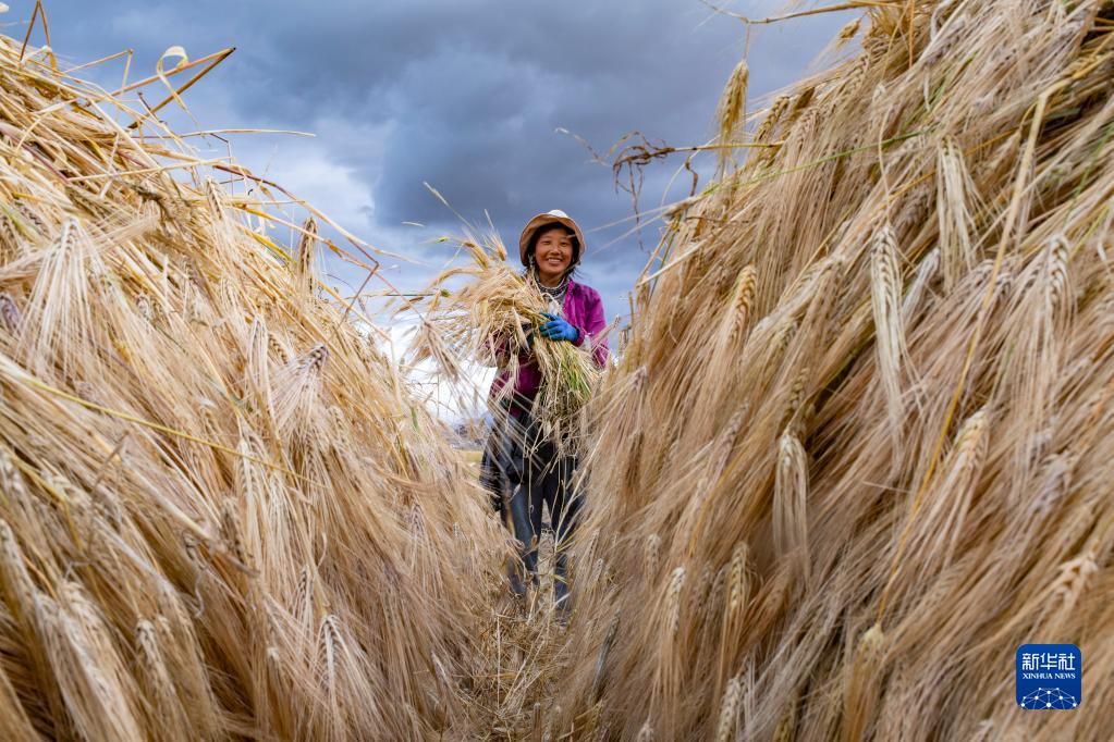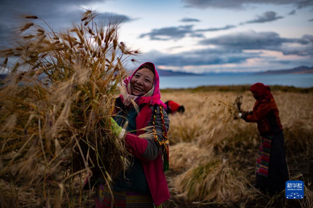 9月23日,西藏那曲市尼瑪縣文部鄉(xiang) 文部南村村民開鐮收割。新華社記者 普布紮西 攝