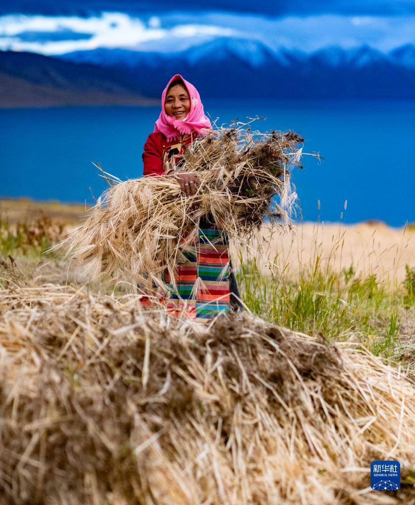 當日,西藏那曲市尼瑪縣文部鄉(xiang) 文部南村村民開鐮收割農(nong) 田裏的青稞。文部鄉(xiang) 文部南村位於(yu) 當惹雍措湖畔,海拔4645米,這裏的村民以“薩馬卓”(半農(nong) 半牧之意)為(wei) 主,在藏北高原獨具特色。