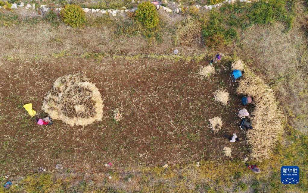9月23日清晨,西藏那曲市尼瑪縣文部鄉(xiang) 文部南村村民開鐮收割(無人機照片)。新華社記者 晉美多吉 攝