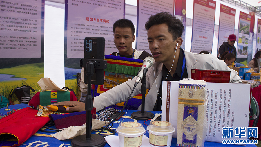 圖為(wei) 在農(nong) 產(chan) 品展銷區直播帶貨的展銷人員(9月23日攝)。新華網 達次 攝