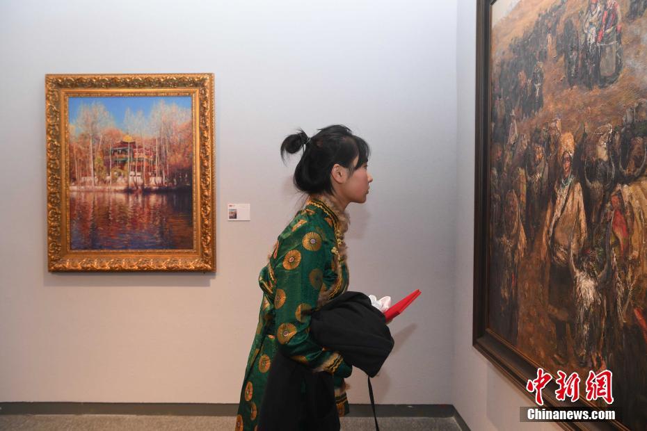 9月26日,“第四屆雪域情西藏油畫展”在西藏自治區自然科學博物館舉(ju) 辦。此次油畫展共展出入選作品80餘(yu) 幅,展期為(wei) 10天。圖為(wei) 一名參觀者在觀看作品。 中新社記者 貢嘎來鬆 攝