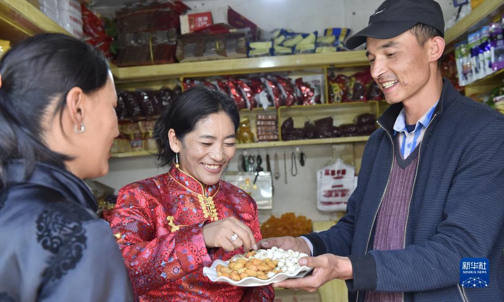 阿卜杜傑力力·麥提如剛(右)於(yu) 2010年從(cong) 新疆和田墨玉縣來到西藏阿裏獅泉河鎮做幹果生意,並融入到獅泉河鎮藏布居委會(hui) 的民族大家庭中。圖為(wei) 阿卜杜傑力力·麥提如剛請當地藏族朋友品嚐來自家鄉(xiang) 的特產(chan) (9月22日攝)。新華社發(索朗羅布 攝)
