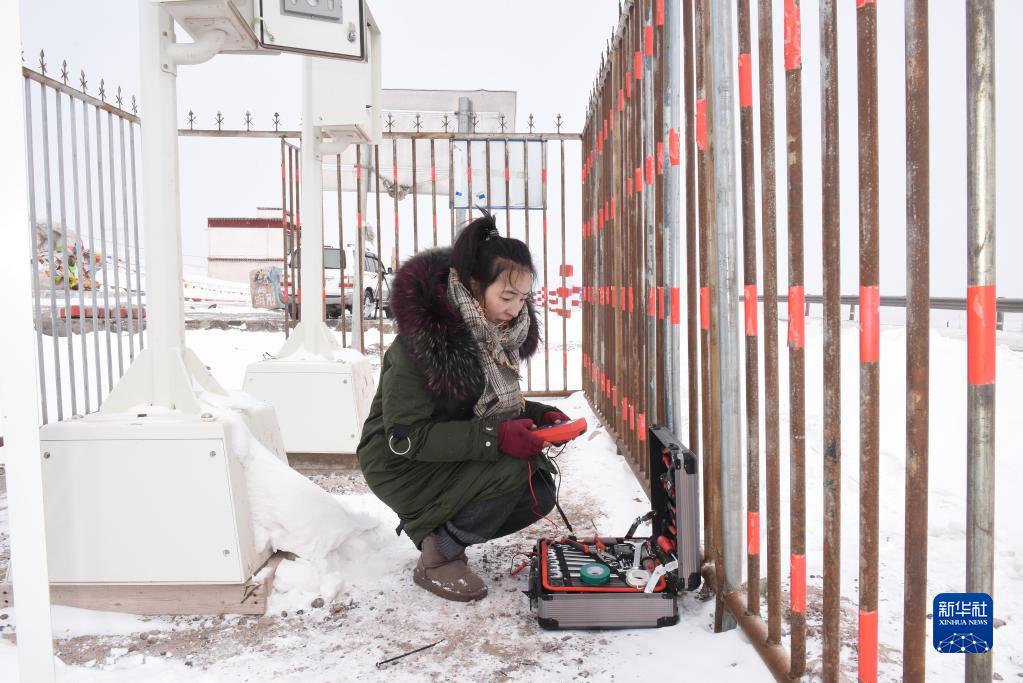 洛鬆拉姆在世界海拔最高有人值守氣象站——安多氣象局唐古拉山交通自動氣象站準備檢修設備(2019年1月28日攝)。新華社記者 周健偉(wei) 攝
