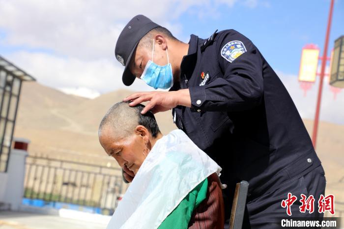 圖為(wei) 普蘭(lan) 邊檢站民警為(wei) 敬老院老人理發。格熱 攝