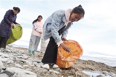 在瑪旁雍措國家級濕地自然保護區吉吾管理站,20歲的濕地保護管護員次仁旺姆和同伴在水邊撿拾垃圾。