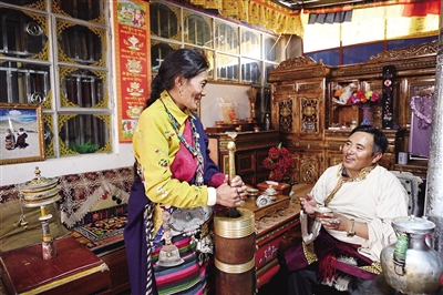 居住在阿裏噶爾縣康樂(le) 新居的斯瓊正在品嚐妻子普珍製作的酥油茶。2017年,斯瓊一家從(cong) 海拔4570米的改則縣麻米鄉(xiang) 搬入了噶爾縣生態安置小區康樂(le) 新居。據了解,根據西藏自治區黨(dang) 委、政府的決(jue) 策部署,當地政府對海拔4700米以上極高海拔地區實施生態搬遷,實現群眾(zhong) 脫貧致富和生態環境改善。