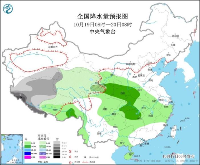 10月19日08時至20日08時,新疆東(dong) 南部、西藏中西部、青海西部等地部分地區有小到中雪,其中,西藏西南部部分地區有大到暴雪(10~11毫米)。西藏東(dong) 南部、甘肅南部、陝西中南部、山西南部、河南西南部、湖北西部、湖南北部等地部分地區有中雨(見圖3)。