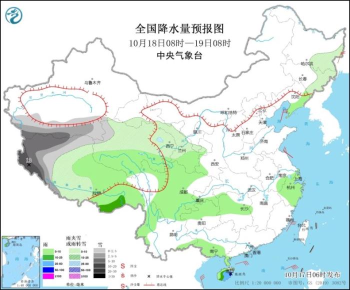 10月17日08時至18日08時,內(nei) 蒙古東(dong) 北部、新疆南疆西部山區等地部分地區有小到中雪,其中,西藏西部等地部分地區有大雪(5~7毫米)。海南島等地部分地區有中到大雨,其中,海南島東(dong) 南部等地部分地區有暴雨(50~80毫米)。內(nei) 蒙古中部、西藏北部等地部分地區有4~5級風(見圖1)。