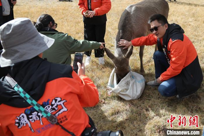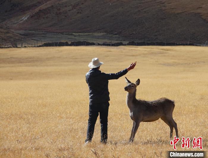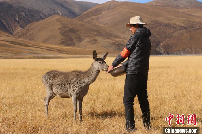 圖為(wei) 西藏類烏(wu) 齊馬鹿國家級自然保護區的管護員正在飼喂馬鹿。冉文娟 攝