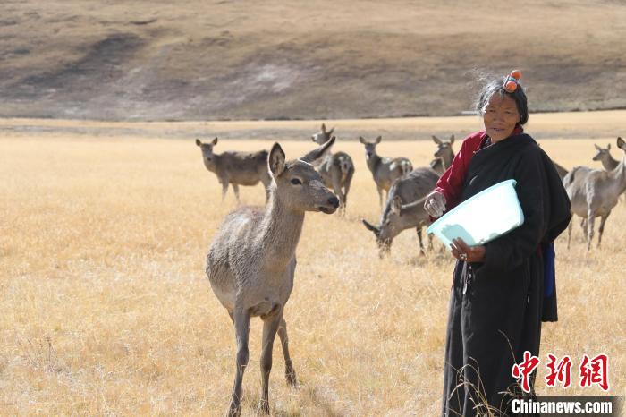 圖為(wei) 和馬鹿打了一輩子交道的藏族阿媽向秋拉姆正在喂食馬鹿。冉文娟 攝