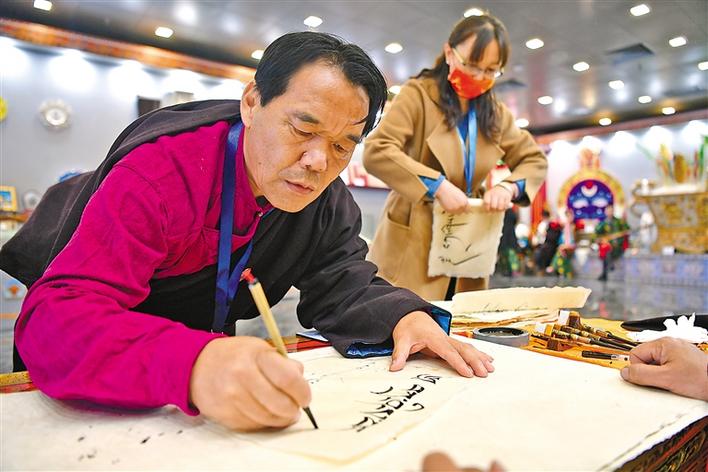 圖為(wei) 非遺傳(chuan) 承人展示藏文書(shu) 法。記者 旦增西旦 攝