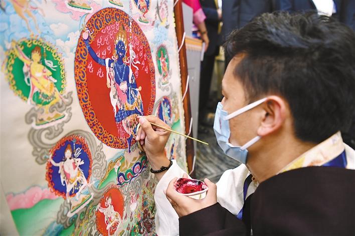 圖為(wei) 非遺傳(chuan) 承人展示唐卡繪製技藝。記者 旦增西旦 攝