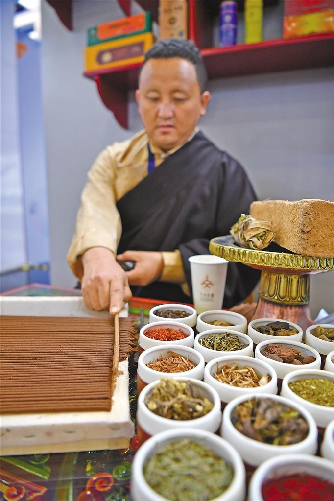 圖為(wei) 非遺傳(chuan) 承人展示藏香製作過程。記者 旦增西旦 攝