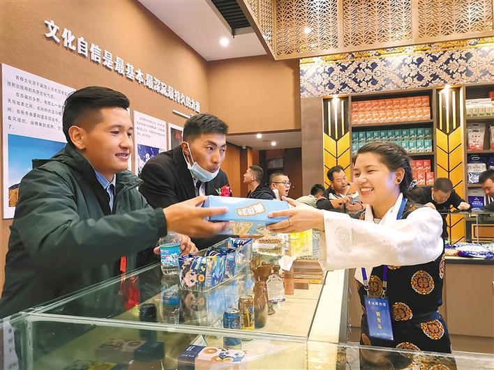 在青稞產(chan) 品展銷區,工作人員向前來參觀的客人推銷青稞產(chan) 品。紮西頓珠 攝