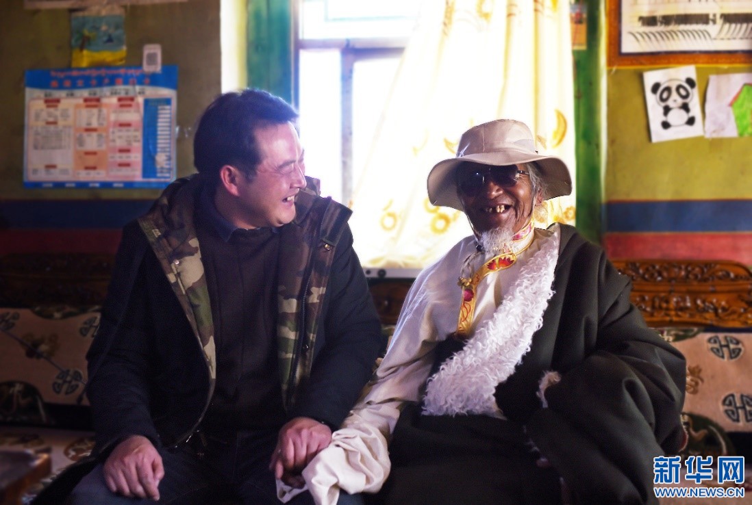 10月30日,邱學彥在跟村民紮塔老人聊天。新華網 旦增努布 攝