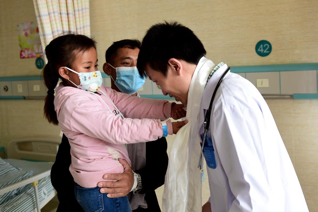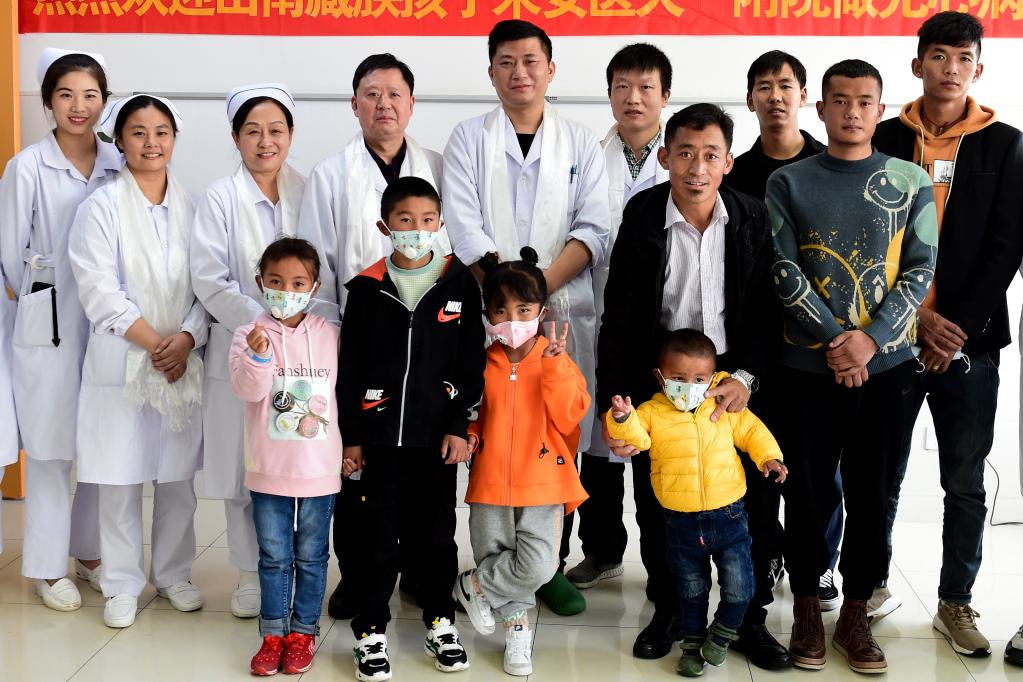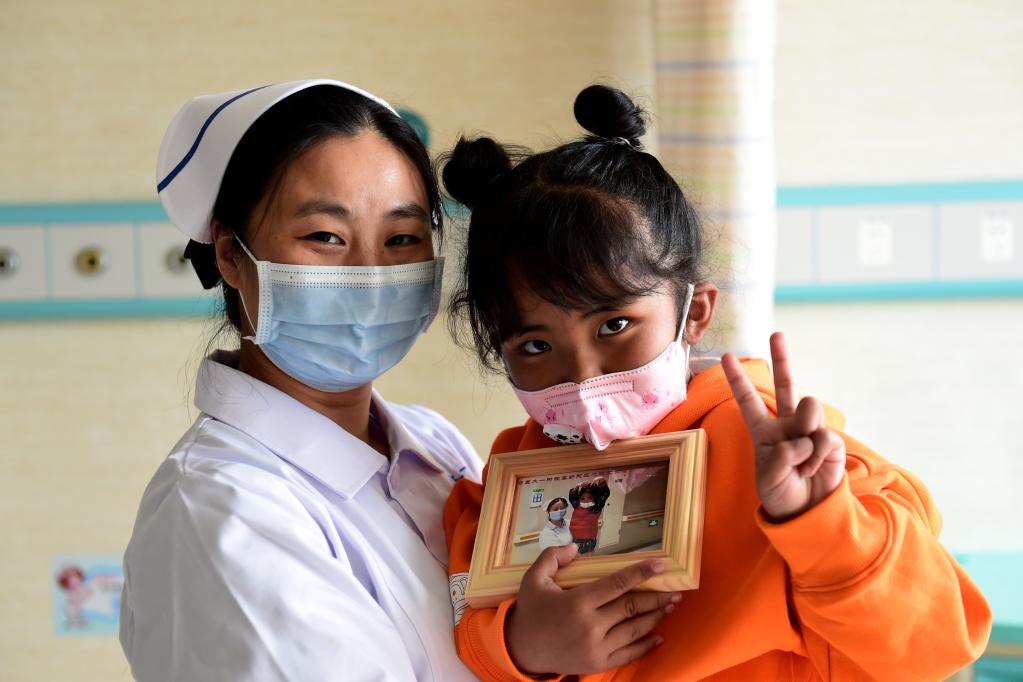 11月2日,4名已康複的先心病患兒(er) 在出院前和醫護人員等合影。黃博涵 攝