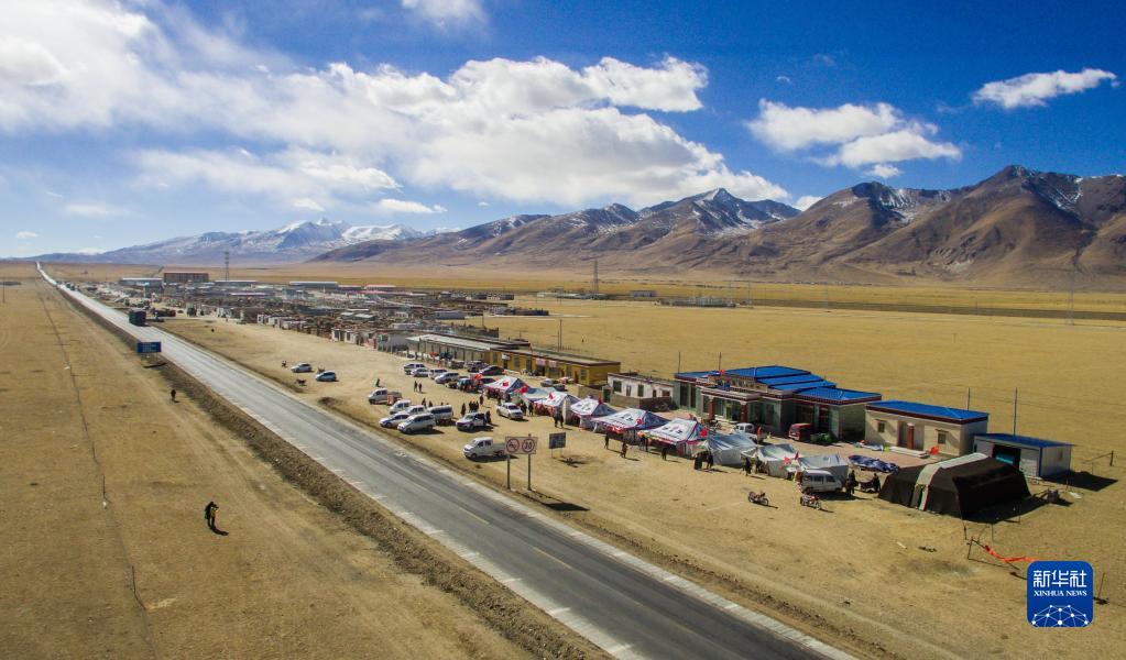 這是在青藏公路旁搭建的那曲縣香茂鄉(xiang) 畜產(chan) 品展銷會(hui) (2017年11月25日攝,無人機照片)。新華社記者 劉東(dong) 君 攝