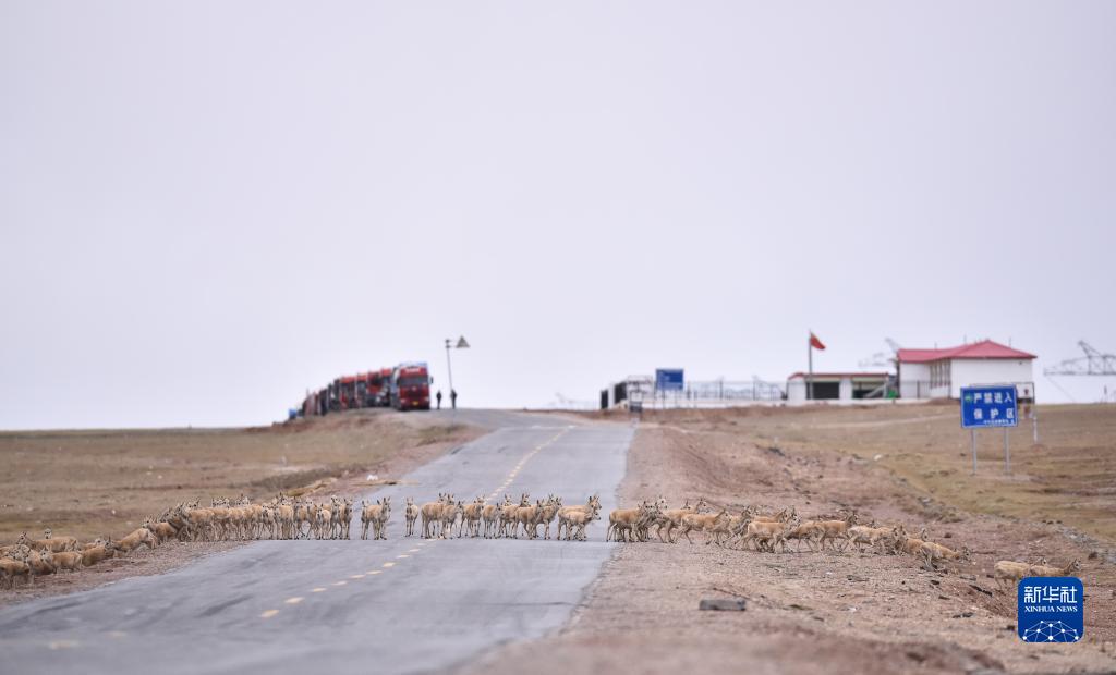在青海可可西裏,一群雌性待產(chan) 藏羚羊正在通過青藏公路(2016年6月7日攝)。新華社記者 吳剛 攝
