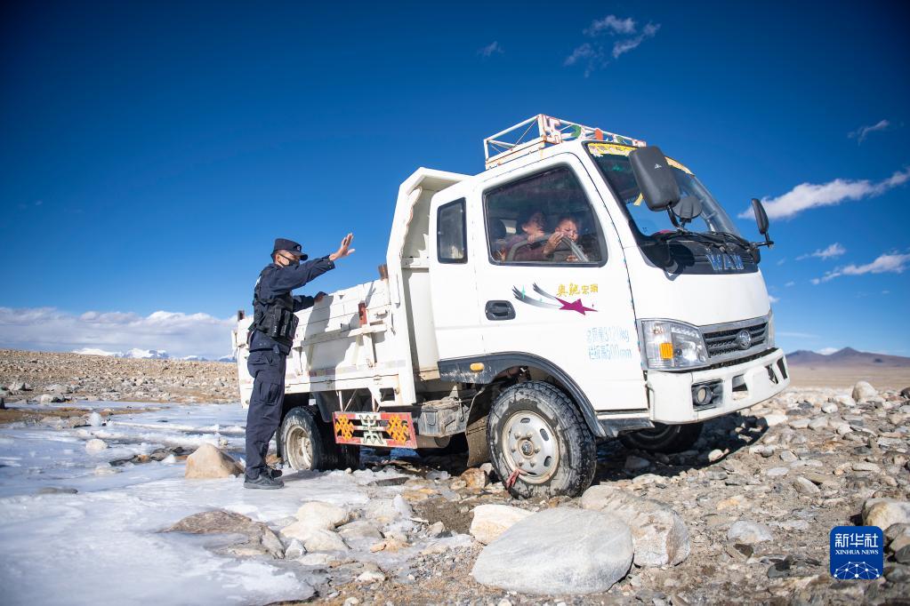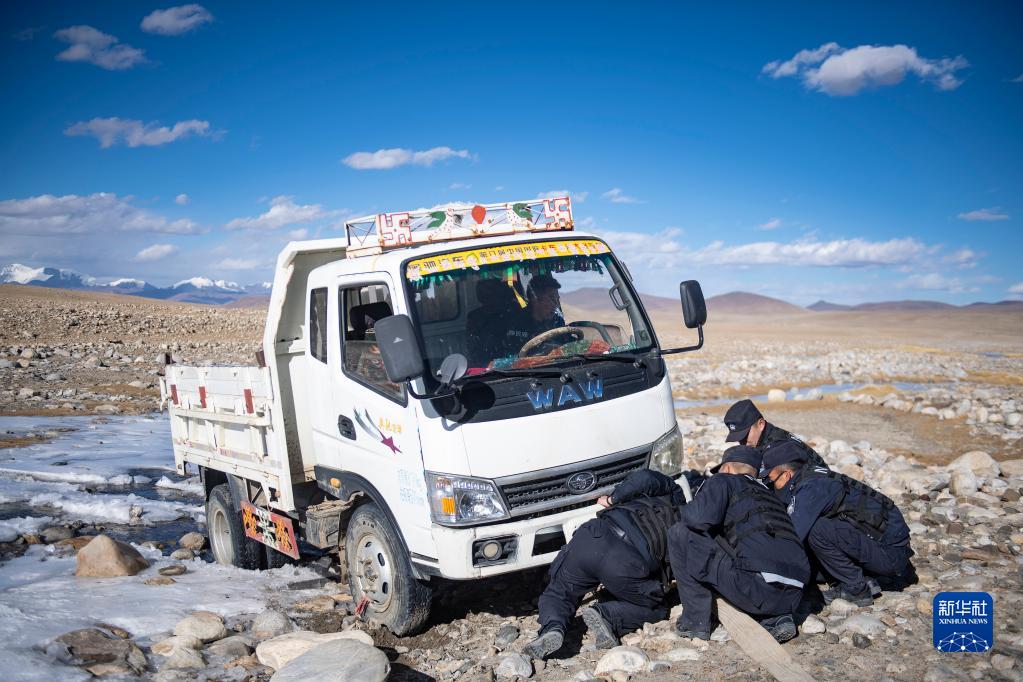 普瑪江塘邊境派出所的移民管理警察在巡邏途中協助牧民旦增多傑一家拖拽“罷工”的小貨車(11月20日攝)。新華社記者 孫非 攝