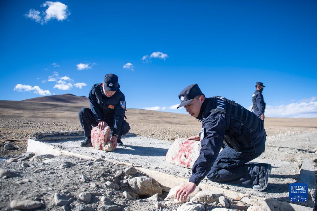 普瑪江塘邊境派出所的移民管理警察們(men) 在巡邏時,扶起被大風吹倒的就地取材製作的“危橋”警示牌(11月20日攝)。新華社記者 孫瑞博 攝