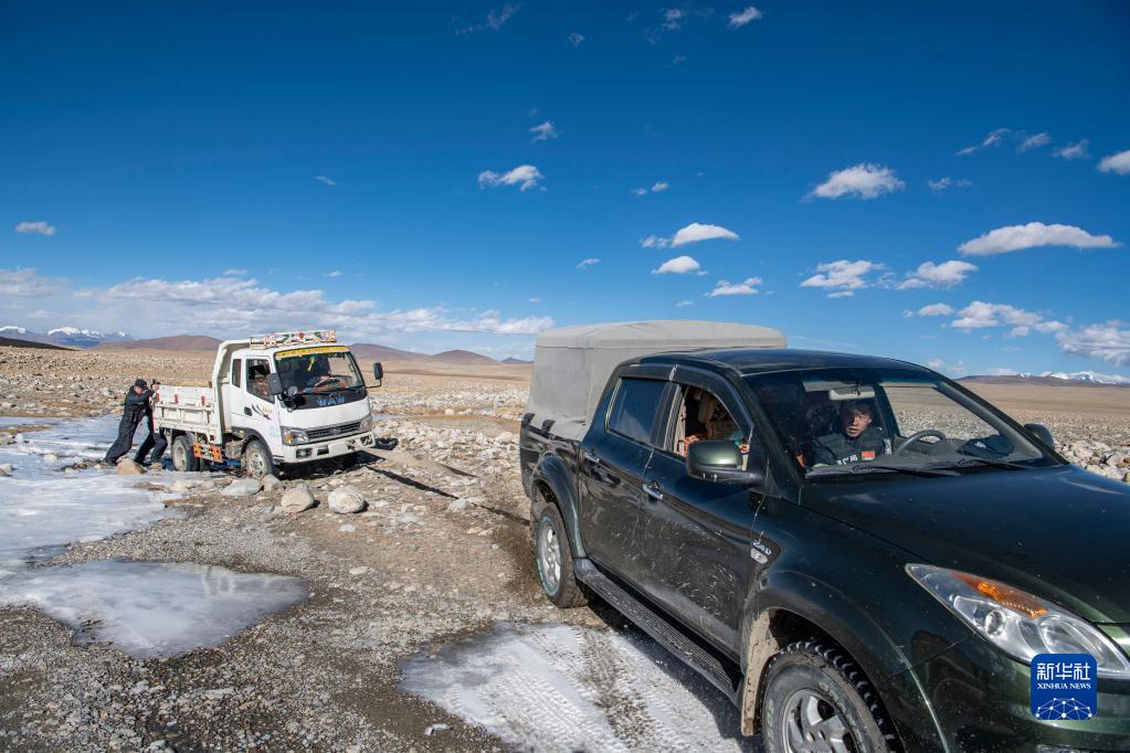 普瑪江塘邊境派出所的移民管理警察們(men) 幫助牧民旦增多傑的小貨車從(cong) 冰河脫困(11月20日攝)。新華社記者 孫瑞博 攝