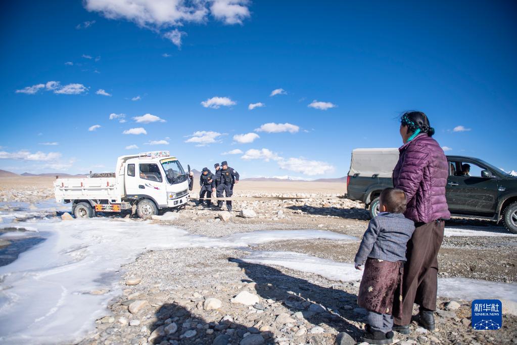 普瑪江塘邊境派出所的移民管理警察幫助牧民旦增多傑的家人離開困在冰河裏的小貨車(11月20日攝)。新華社記者 孫瑞博 攝