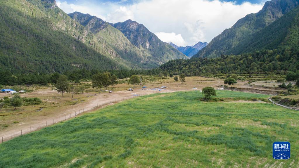西藏林芝市米林縣,“綠哈達行動”中種植的人工草場鬱鬱蔥蔥(2020年9月13日攝,無人機照片)。 新華社記者孫非 攝