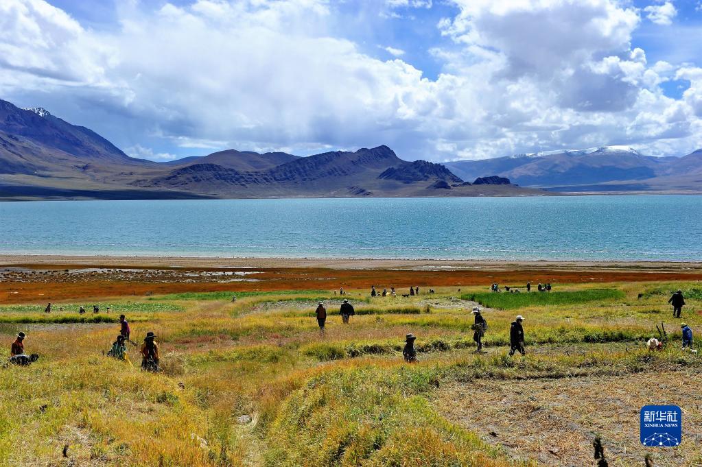 西藏尼瑪縣文部鄉(xiang) 北村村民正在人工草場收割飼草(2017年9月18日攝)。 新華社記者張汝鋒 攝