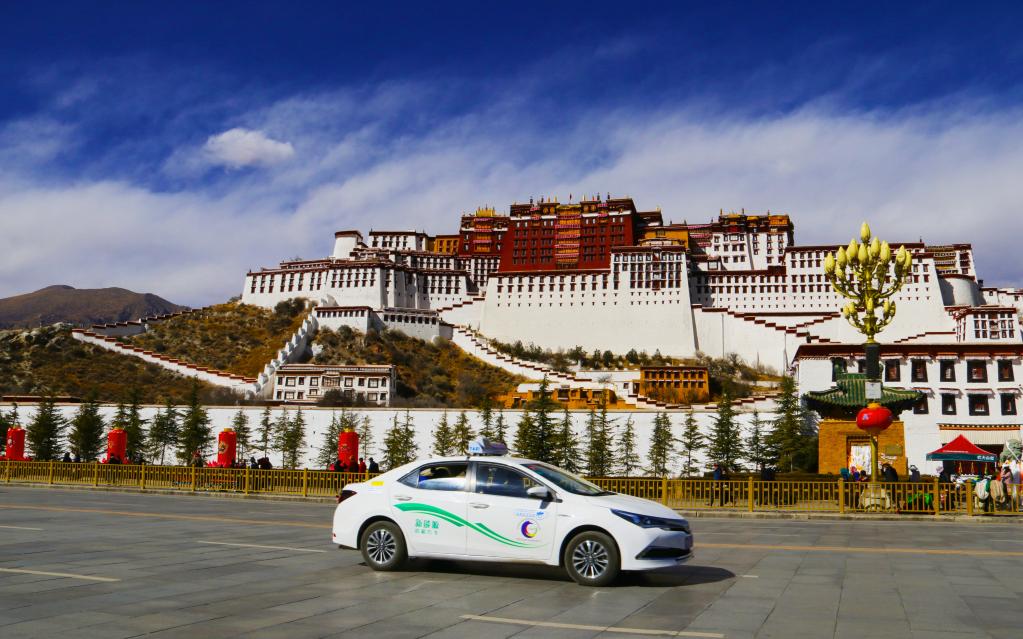 新能源出租車從(cong) 布達拉宮廣場前駛過(2018年2月11日攝)。 新華社發 央梅朵 攝