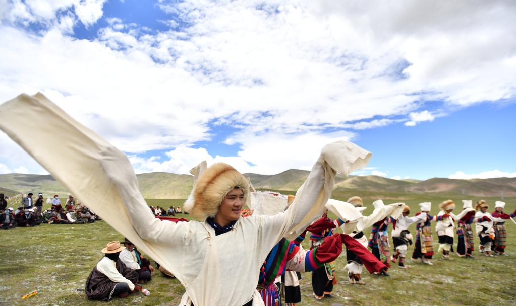西藏班戈縣青龍鄉(xiang) 牧民在草原上跳舞(2021年7月15日攝)。 新華社記者 覺果 攝