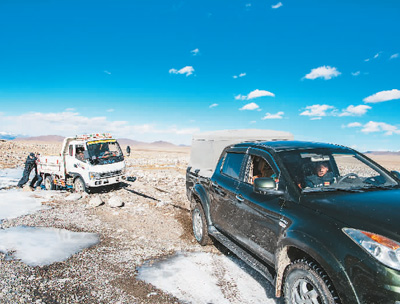 派出所的移民管理警察在巡邏途中協助牧民旦增多傑一家拖拽“罷工”的小貨車。新華社記者 孫非攝