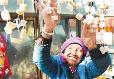 普瑪江塘鄉(xiang) 婦女在晾曬奶渣。新華社記者 普布紮西攝