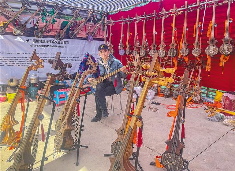 圖為(wei) 銷售民族樂(le) 器的商戶正在為(wei) 消費者現場彈奏“紮念”。