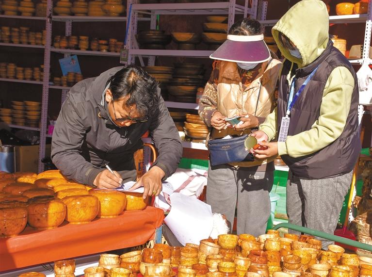 山南本地的特色優(you) 質商品尤其受到青睞:紮囊的氆氌,洛紮的粉絲(si) ,瓊結的蕎麥麵,加查的核桃、木碗,貢嘎的邦典、紅土豆,措美的奶渣、牛羊肉等等,紛紛占據重要展位,引來消費者紛至遝來,熱情選購。