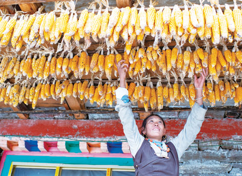 陳塘鎮夏爾巴人尼瑪在整理玉米(11月25日攝)。 普布紮西、格桑邊覺、孫瑞博攝