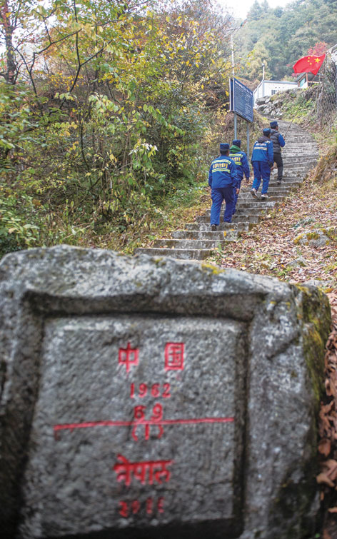 夏爾巴巡邊員們(men) 沿著中尼邊境巡邏時經過界碑(11月24日攝)。普布紮西、格桑邊覺、孫瑞博攝