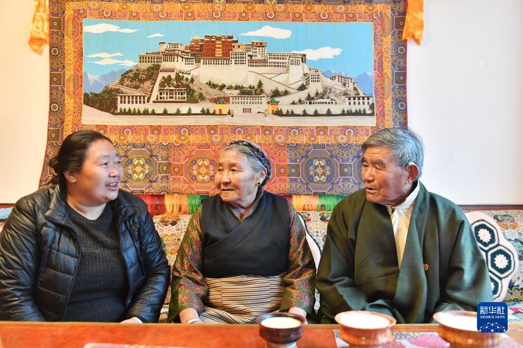 土丹堅參老人(右)和老伴(中)、女兒(er) 在一起聊天(5月11日攝)。新華社記者 孫瑞博 攝