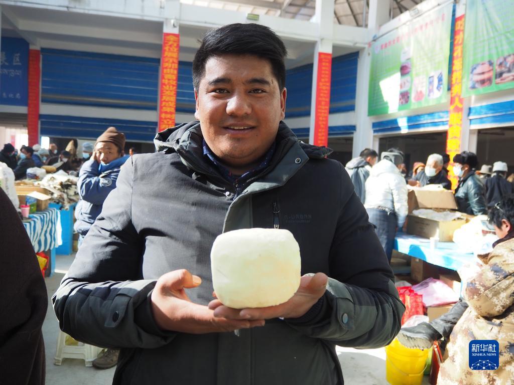 康鬆旺堆捧著自家製作的酥油。(2021年12月10日攝) 新華社記者 金一清 攝