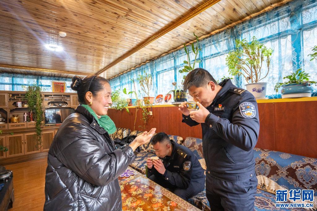 民警幫轄區群眾(zhong) 劈完柴火後,群眾(zhong) 請民警喝一杯酥油茶(12月7日攝)。新華社發 (晴雯、彭維熙、劉戀報道)